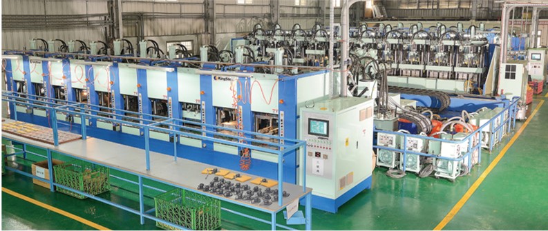 EVA molding machines are vertical multi-station & use multiple molds. The molds are heated which is required for the cross linking of compound material, when the cycle time is finished the molds open and the part rapidly out from the mold (the part literally “pops” out of the mold) hence we use the brand name of POPFOAM for EVA molding products.